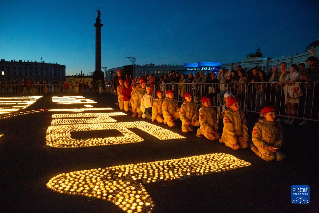 6月22日凌晨,人们在俄罗斯圣彼得堡冬宫广场点燃蜡烛,纪念卫国战争爆发81周年。