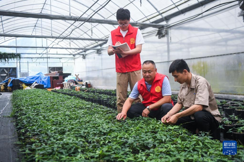 6月22日,昌化镇“e起牛”党建联盟的农技人员(中)来到当地中草药种植基地,查看三叶青的长势并进行技术指导。