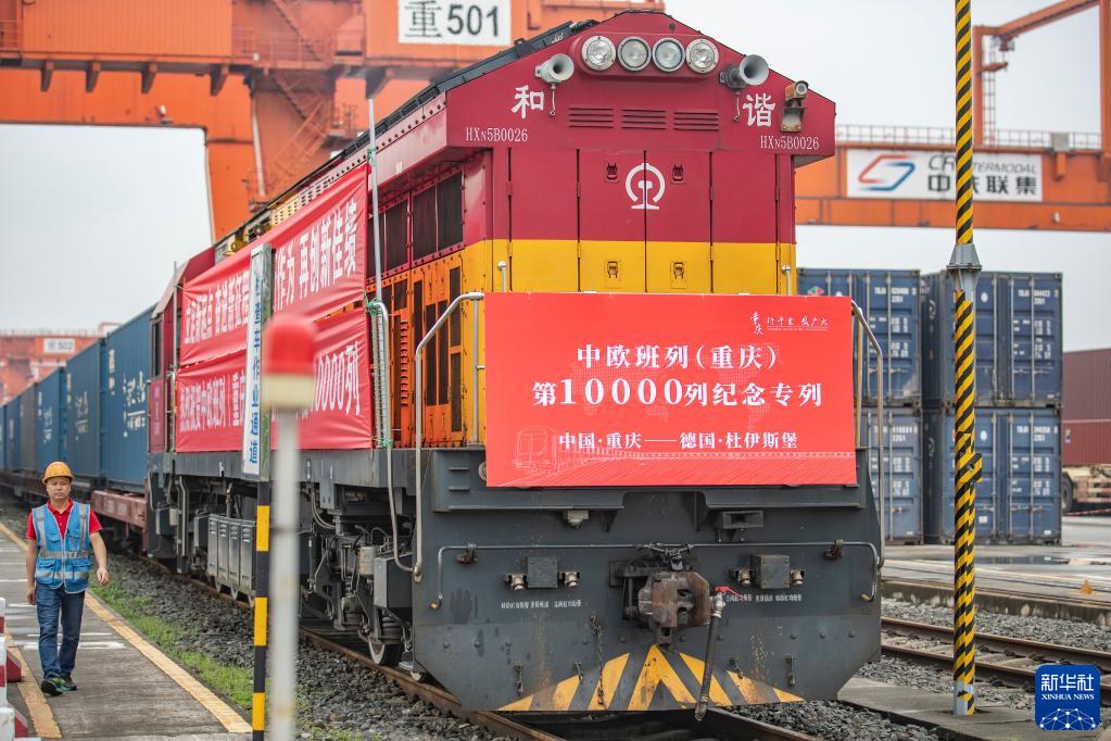 当日,第10000列中欧班列(重庆)满载着100个标箱的电子产品、机械零件、日用百货等货物,从重庆团结村中心站顺利驶出,一路向西,奔赴一万余公里外的德国杜伊斯堡。重庆成为全国首个累计重箱折列开行量突破 10000 列的中欧班列开行城市。