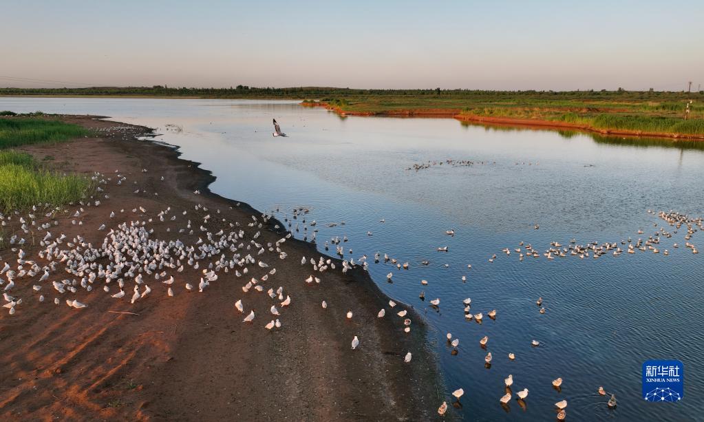 朝霞中的红碱淖鸟岛(6月23日摄,无人机照片)。