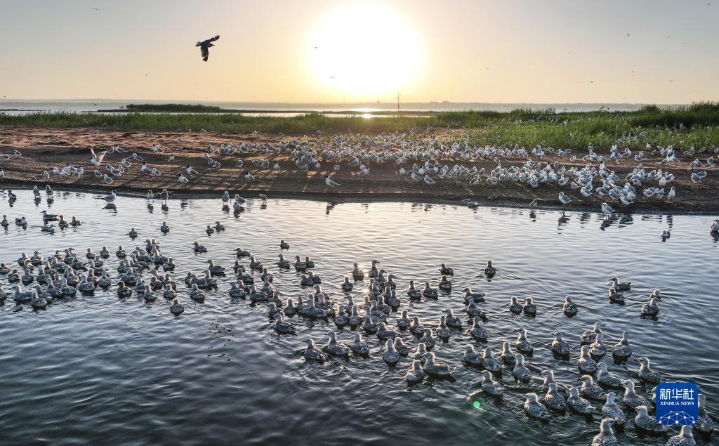 朝霞中的红碱淖鸟岛(6月23日摄,无人机照片)。