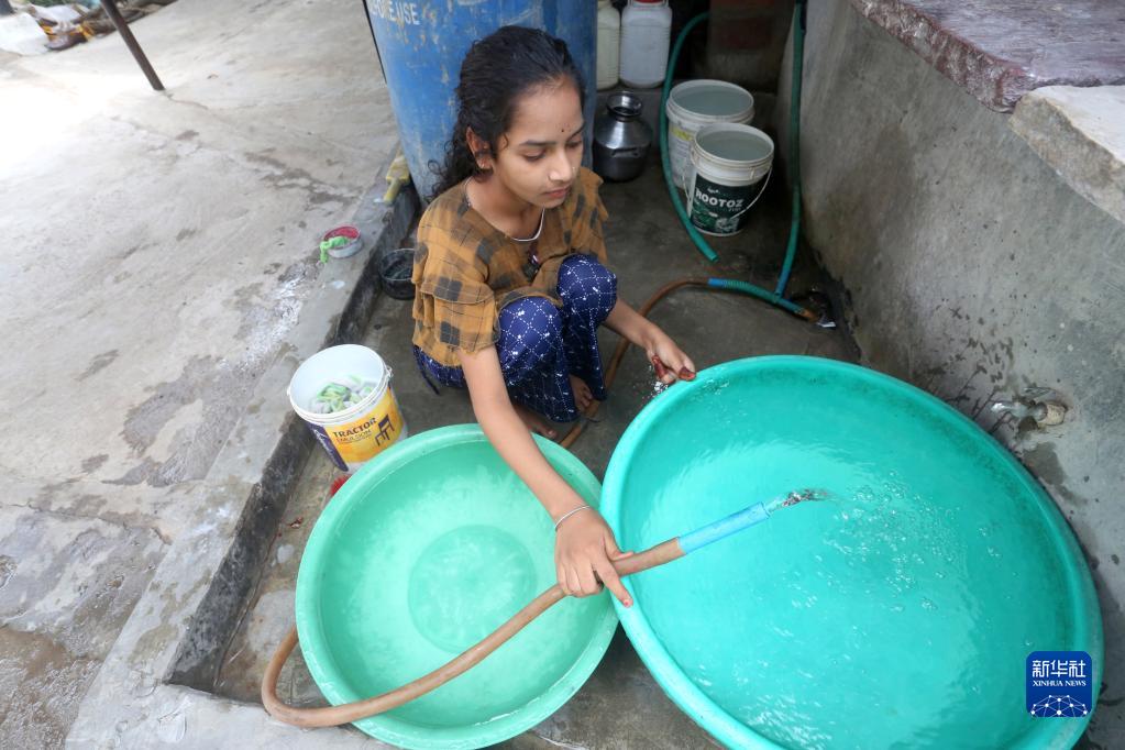 6月22日,女孩在印度中央邦博帕尔戈拉村通过水管打水。