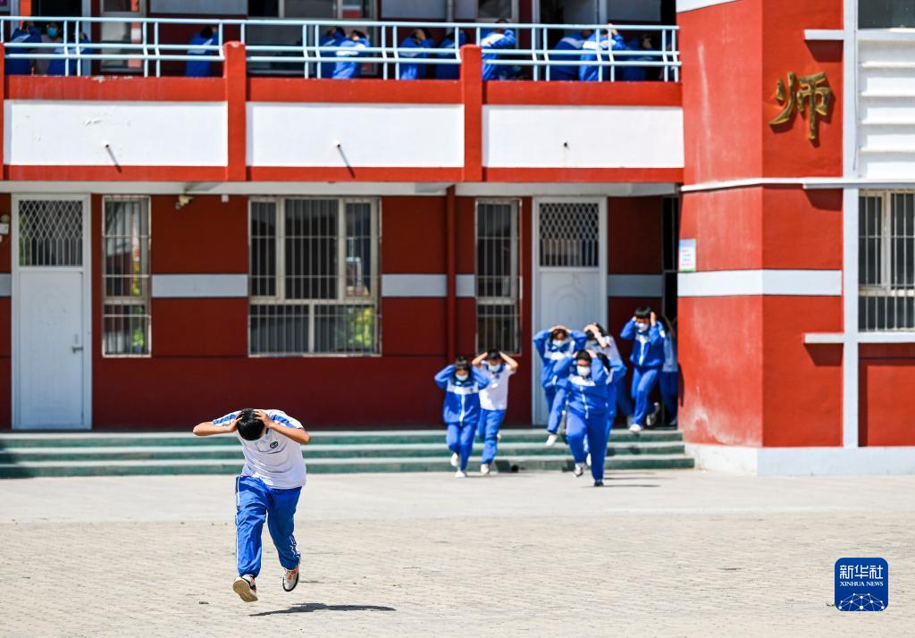 6月23日,在呼和浩特市和林格尔县第二中学,学生们进行疏散演练。