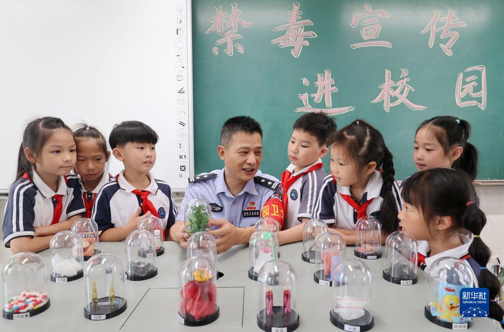 6月23日,在浙江省湖州市德清县莫干山镇中心学校,民警向学生讲解毒品危害。