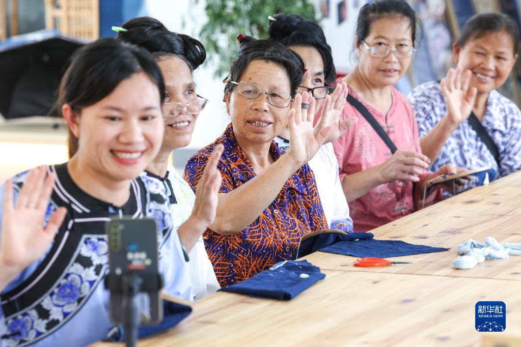 6月23日,在贵州省黔东南苗族侗族自治州榕江县特和社区“母亲回家手工坊直播中心”内,主播王洪丹(左一)与当地绣娘和直播间里的观众打招呼。