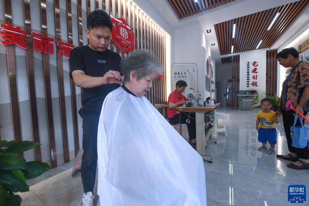 6月23日,杭州市临安区锦南街道党群服务中心组织志愿者在兰锦社区给居民提供理发、衣物缝补等服务。