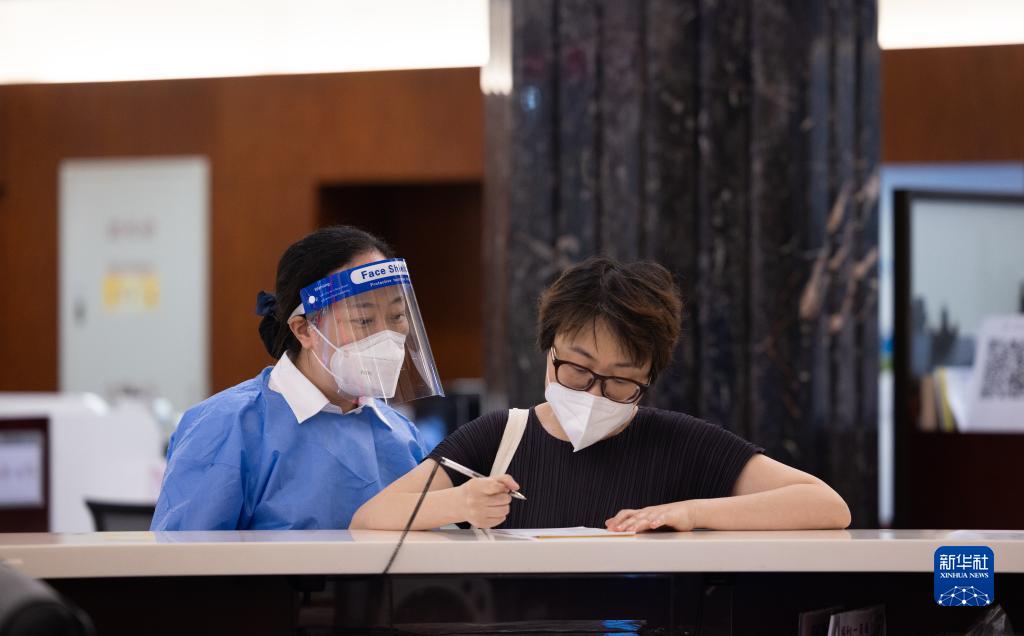 6月21日,李婷(左)在营业大厅指导客户填写表格。