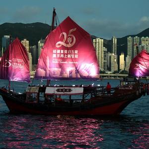 一艘帆船挂上庆祝香港回归祖国25周年横幅在维港航行(6月23日摄)。