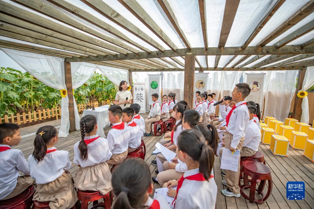 6月22日,在重庆两江新区星湖学校教学楼顶,语文教师吴敏(中)在向日葵园中给学生们上沉浸式融合课时与学生互动。