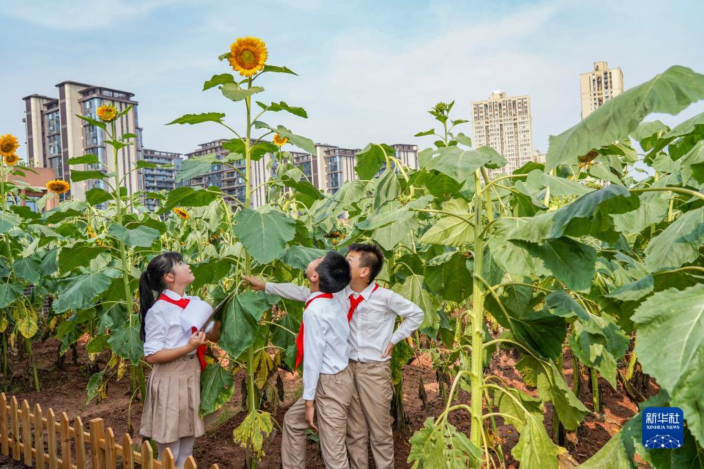 6月22日,在重庆两江新区星湖学校教学楼顶的向日葵园中,学生在完成向日葵全融合趣评嘉年华测评。