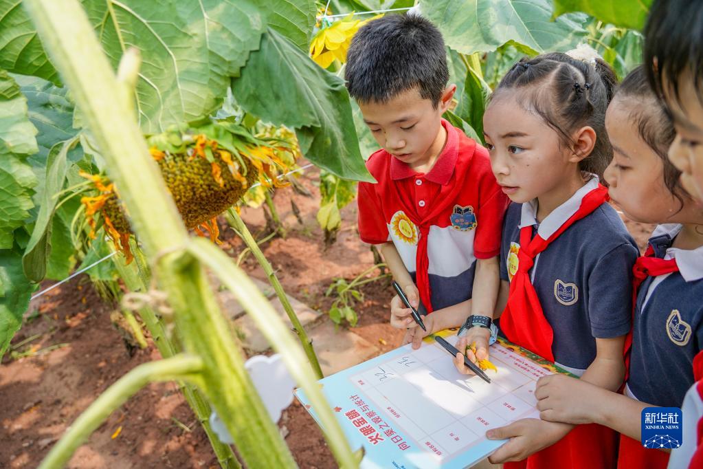 6月22日,在重庆两江新区星湖学校教学楼顶的向日葵园中,学生在向日葵全融合趣评嘉年华测评中观察向日葵的生长构造。