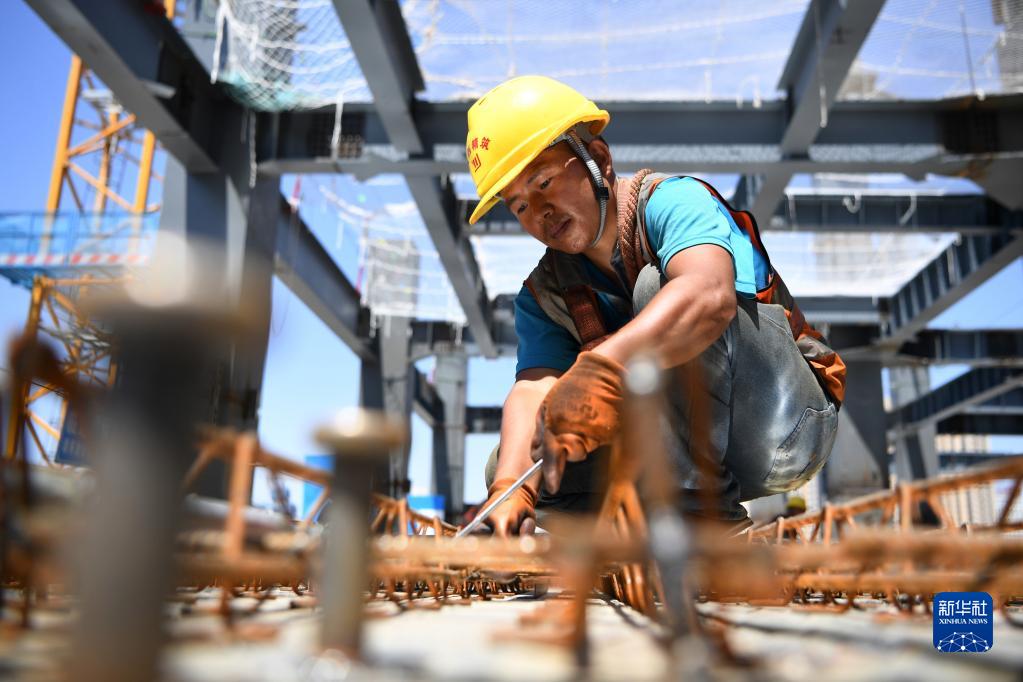6月24日,在中建三局承建的甘肃省中医院西北区域中医医疗中心建设项目工地上,钢筋工马吾麦来在绑扎钢筋。