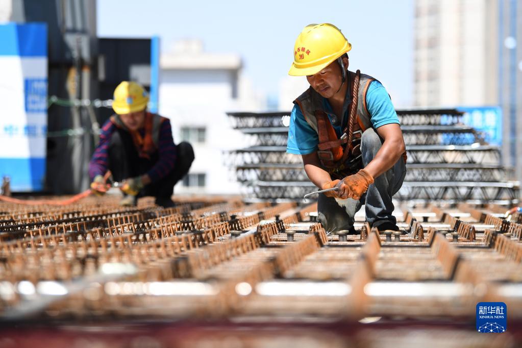 6月24日,在中建三局承建的甘肃省中医院西北区域中医医疗中心建设项目工地上,钢筋工马吾麦来(右)在绑扎钢筋。