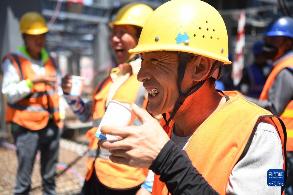 6月24日,在中建三局承建的甘肃省中医院西北区域中医医疗中心建设项目工地上,建筑工人利用休息时间喝绿豆汤消暑。