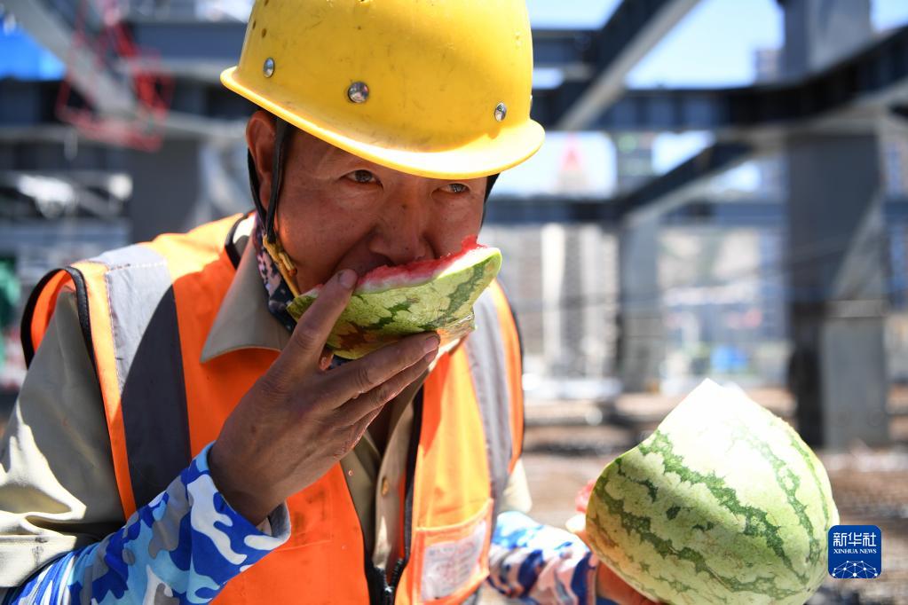 6月24日,在中建三局承建的甘肃省中医院西北区域中医医疗中心建设项目工地上,建筑工人利用休息时间吃西瓜消暑。