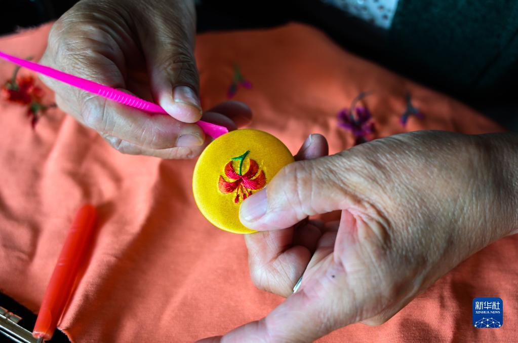 6月23日,在萨日朗巾帼民族手工艺合作社,一名绣娘在加工带有“萨日朗”的胸针。