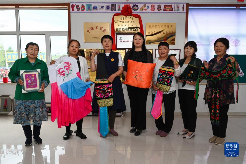 6月23日,在萨日朗巾帼民族手工艺合作社,绣娘们拿着手工艺品合影。