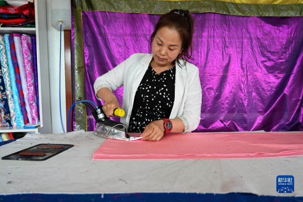 6月23日,在萨日朗巾帼民族手工艺合作社,一名绣娘在熨烫手工艺品。