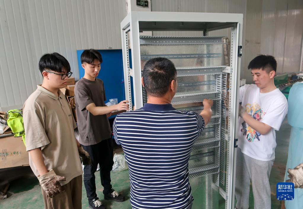 4月9日,在重庆电子工程职业学院在校学生李晨创办的重庆西丹机电设备工程有限公司自有工厂,李晨(左一)和创业团队的成员们在紧张工作。