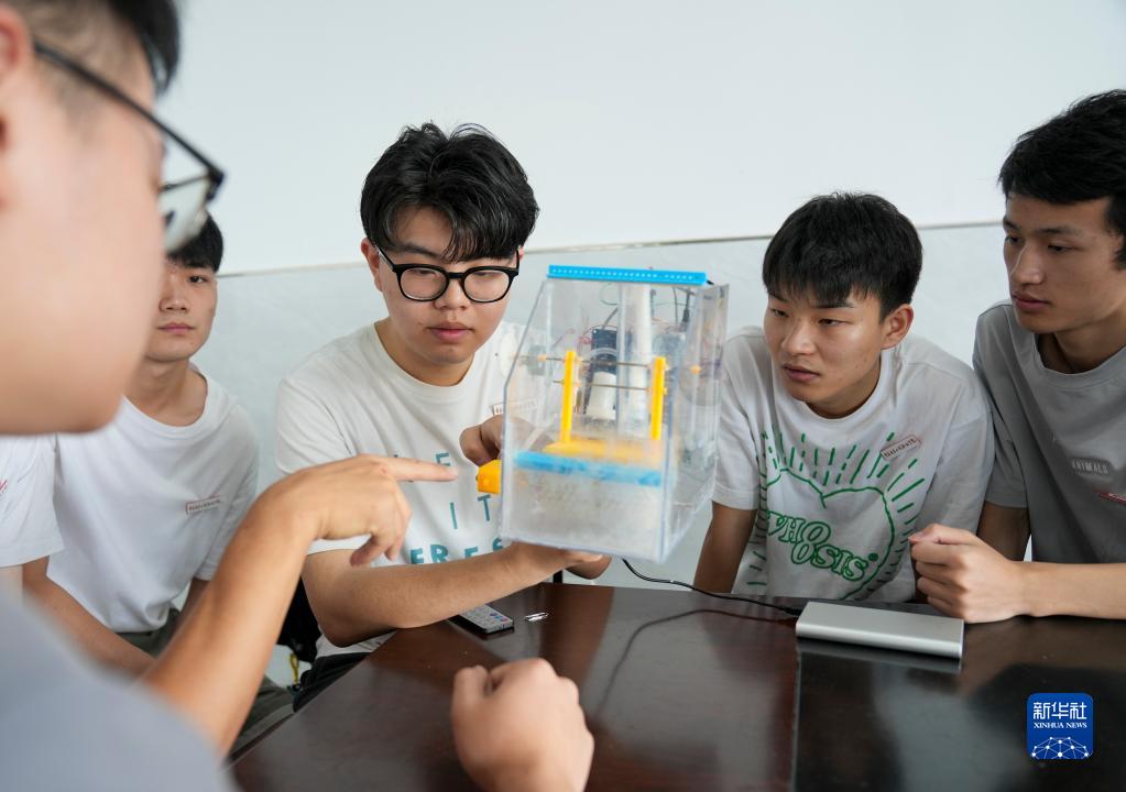 6月21日,在重庆电子工程职业学院为大学生创业孵化提供的办公室,李晨(右三)和创业团队的成员们就新设计研发的自动扶梯自动化清洗系统模型样机进行技术研讨。
