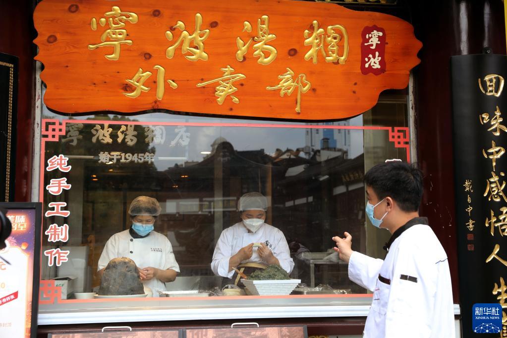 6月22日,宁波汤团店包汤圆的师傅(左)和老桐椿包馄饨的师傅在宁波汤团店的展示窗内现场制作。新华社记者 刘颖 摄
