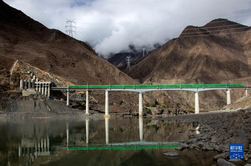 4月14日,复兴号列车行驶在西藏朗县境内的雅鲁藏布江上。