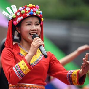 6月23日,广西大化瑶族自治县一名瑶族姑娘在表演布努瑶传统节目——“笑酒”。