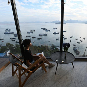 6月22日,游客在霞浦县三沙镇东壁村的“拾间海”民宿观赏海景。