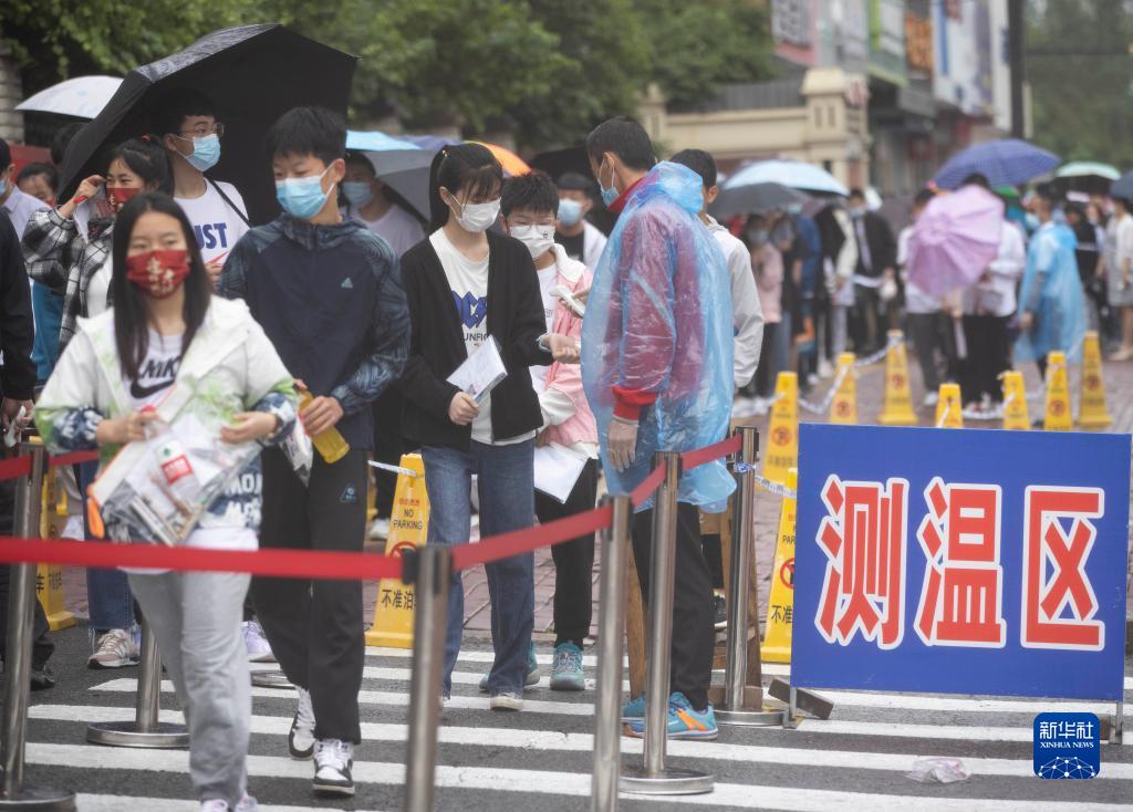 6月25日,在哈尔滨市第七十二中学考点,考生测温后进入考场。