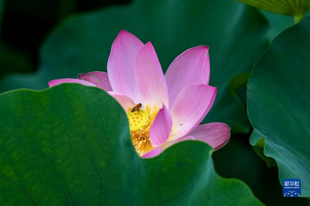 6月20日,在江苏省淮安市楚秀园的荷塘中,蜜蜂在盛开的荷花上采蜜。
