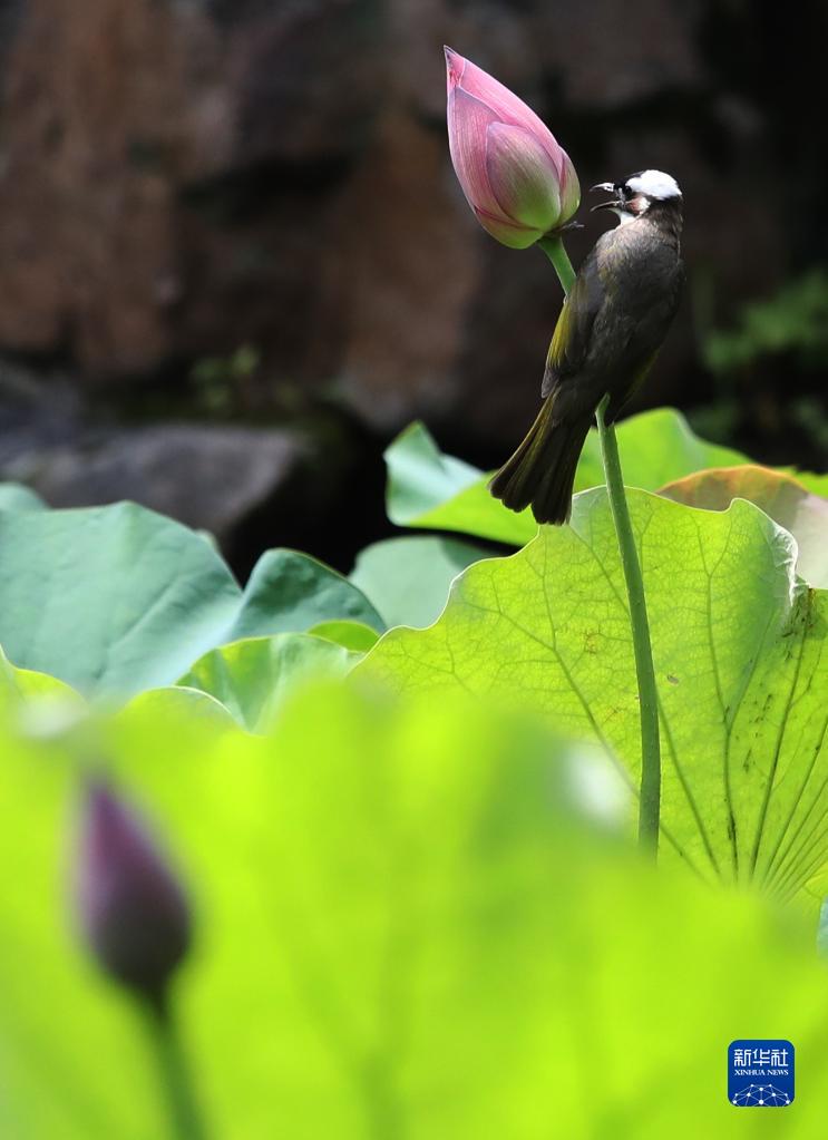6月21日,在江苏苏州拙政园,一只小鸟停在荷花上。
