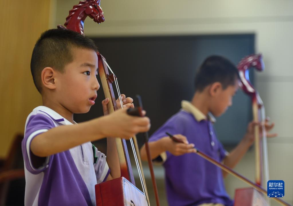 6月24日,在包头市昆都仑区包钢第十七小学,学生们在学习马头琴。