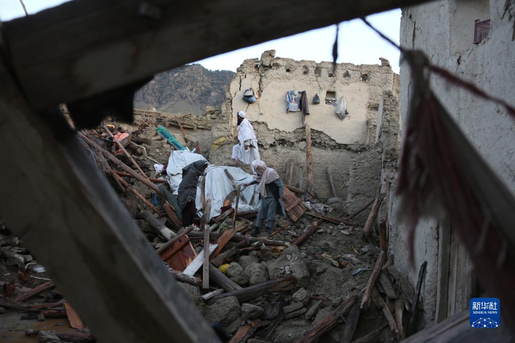 6月23日,人们站在阿富汗东部帕克提卡省被地震损毁的房屋中。