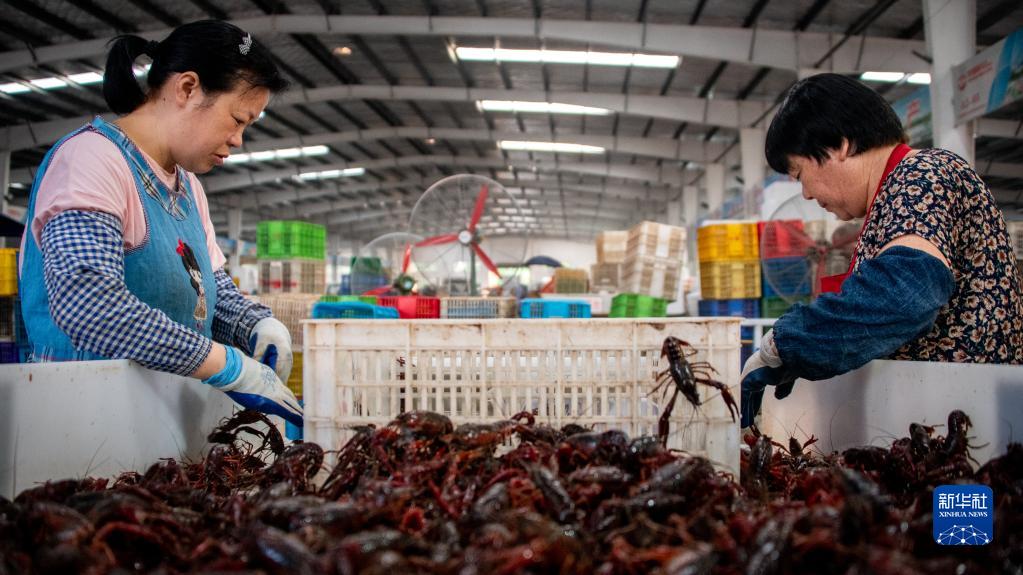 6月25日,在湖北潜江市中国小龙虾交易中心,工作人员在分拣小龙虾。