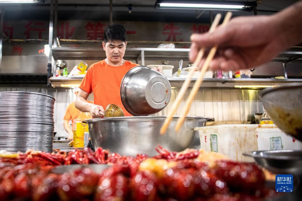 6月24日,在湖北潜江的一家饭店,厨师将小龙虾装盘。
