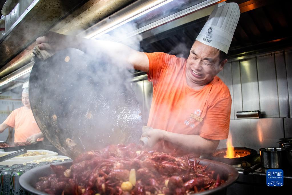 6月24日,在湖北潜江的一家饭店,厨师制作小龙虾菜品。