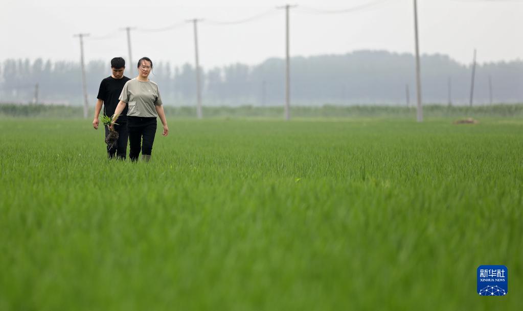 6月23日,高月(前)和同事在富家镇四台子村稻田里巡查作物长势。