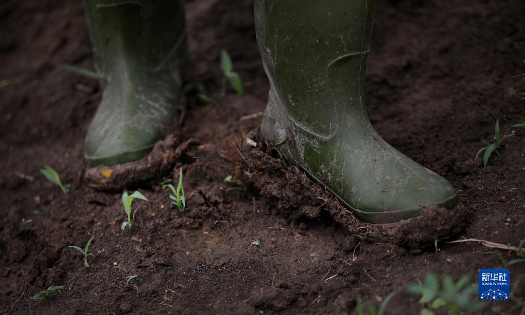 高月的靴子底部沾满了厚厚的黑土(6月23日摄)。