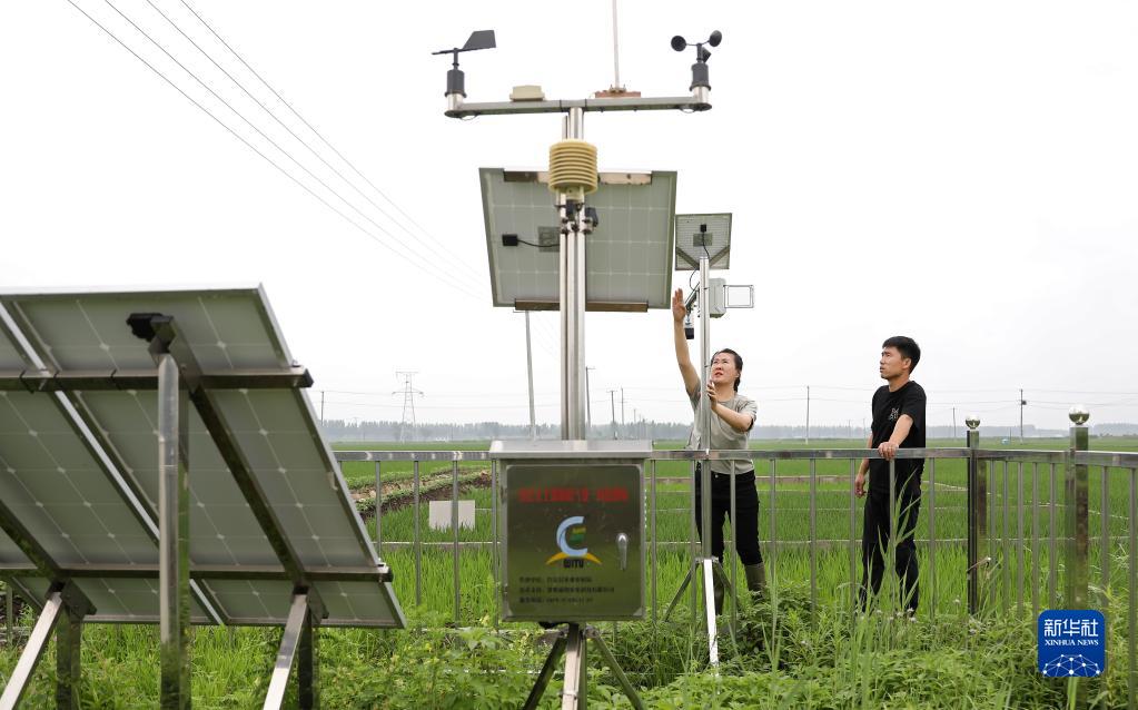 6月23日,高月(左)和同事在富家镇四台子村黑土地质量监测点查看观测仪器工作情况。