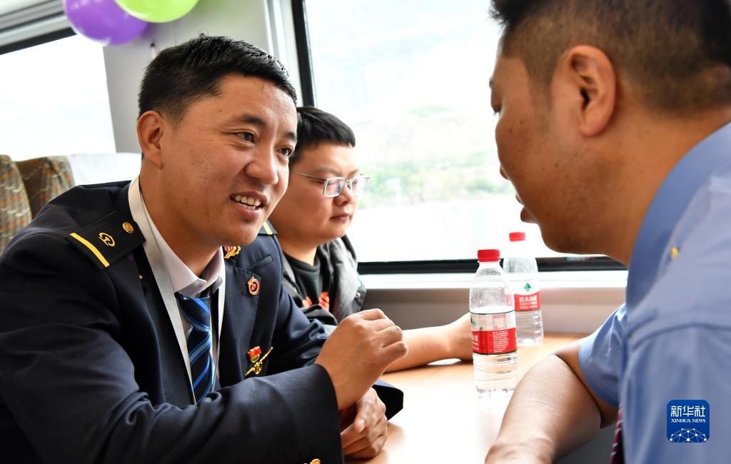 6月25日,斯朗旺扎在火车上与朋友聊天。