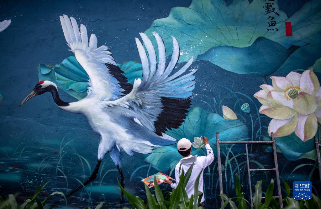 刘志诚在永胜县三川镇进行墙绘创作(6月24日摄)。
