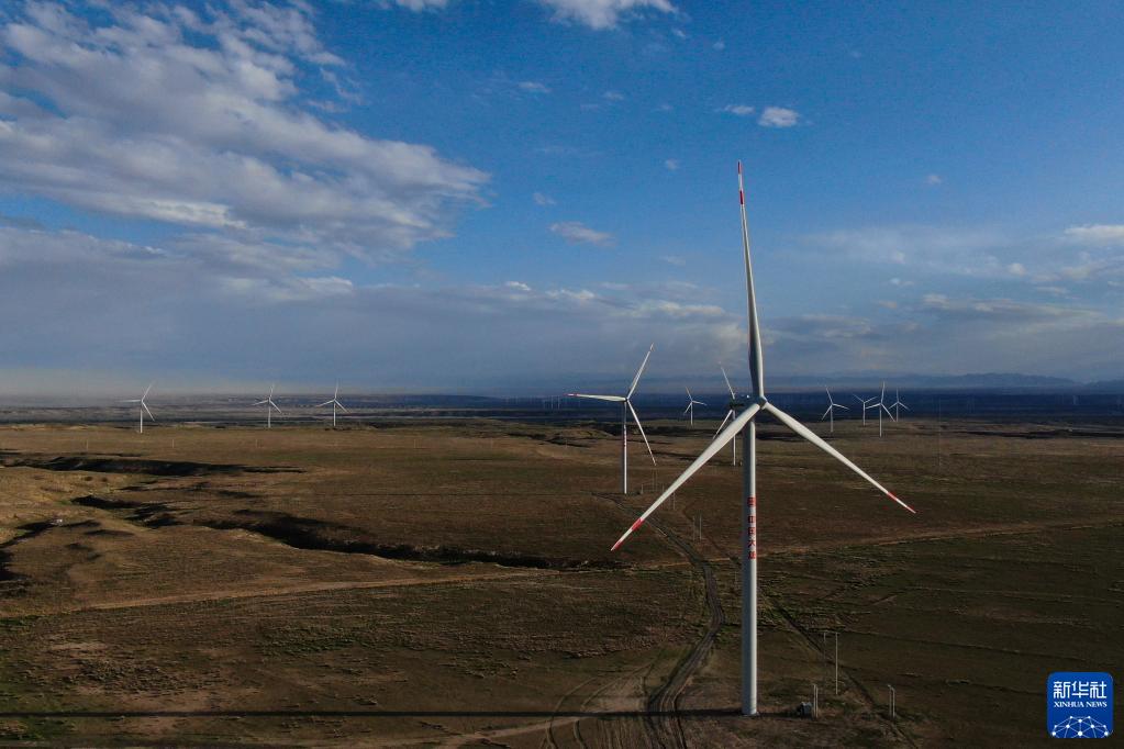 这是6月26日在青海省海南藏族自治州共和县拍摄的风力发电机(无人机照片)。