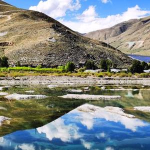 这是拉萨河畔景致(6月18日摄,手机照片)。夏日的拉萨河谷,蓝天白云、绿水青山,油菜花和麦浪宛如调色板,构成一幅生机勃勃的高原景致。新华社记者 沈虹冰 摄