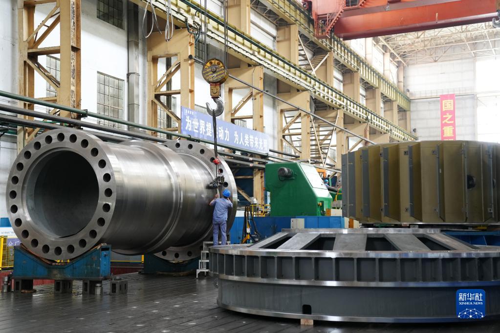 6月27日,在哈电集团哈尔滨电机厂有限责任公司车间,工人在进行生产作业。