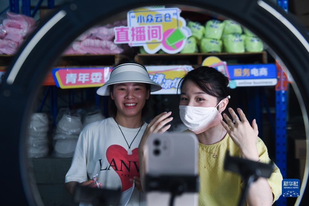 6月27日,在义乌市苏溪镇爱德玛电商园的“小众云仓”站点内,工作人员在进行夏季防晒用品直播销售。