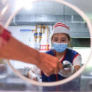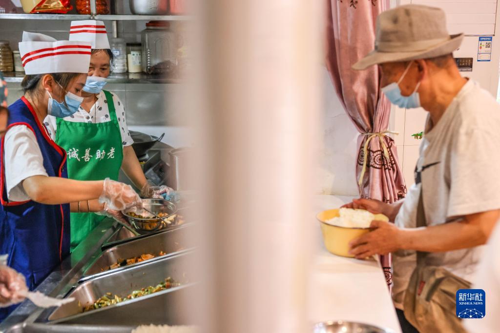 6月27日,佘娅(左)在贵阳诚善助老互助餐厅红岩东郡店内为老人打餐。