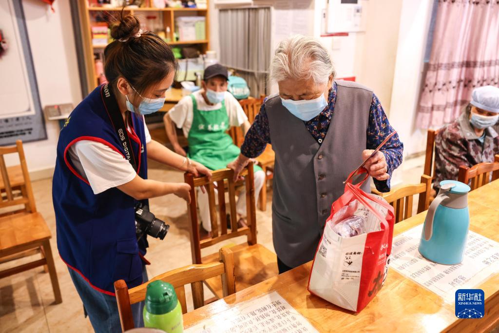 6月27日,佘娅(左)搀扶老人进入贵阳诚善助老互助餐厅红岩东郡店。
