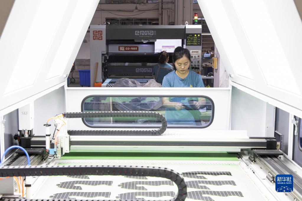 6月27日,福建省泉州市丰泽区一家制鞋企业,工人在冲裁自动印线工序操作机器。