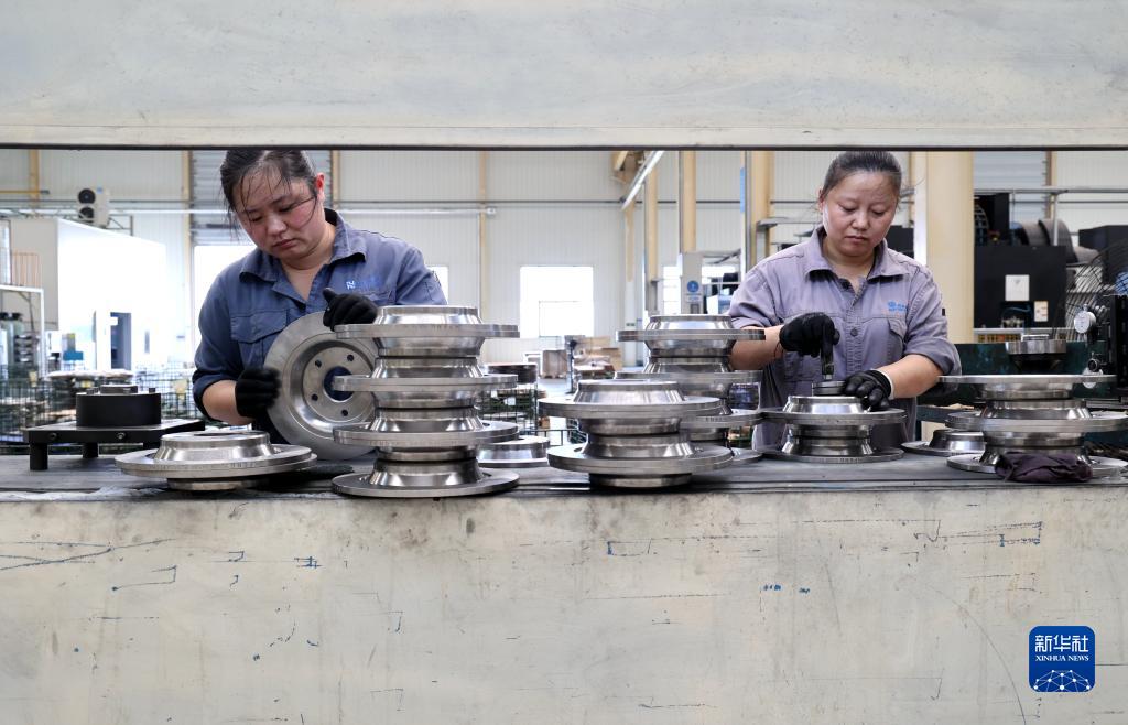 6月27日,山东省滨州市惠民县一家汽车零部件生产企业车间内,工人加紧生产汽车制动盘订单。