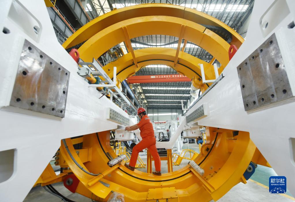 6月27日,浙江中铁装备位于杭州市萧山区的盾构机生产基地,工人安装新型盾构机的部件。